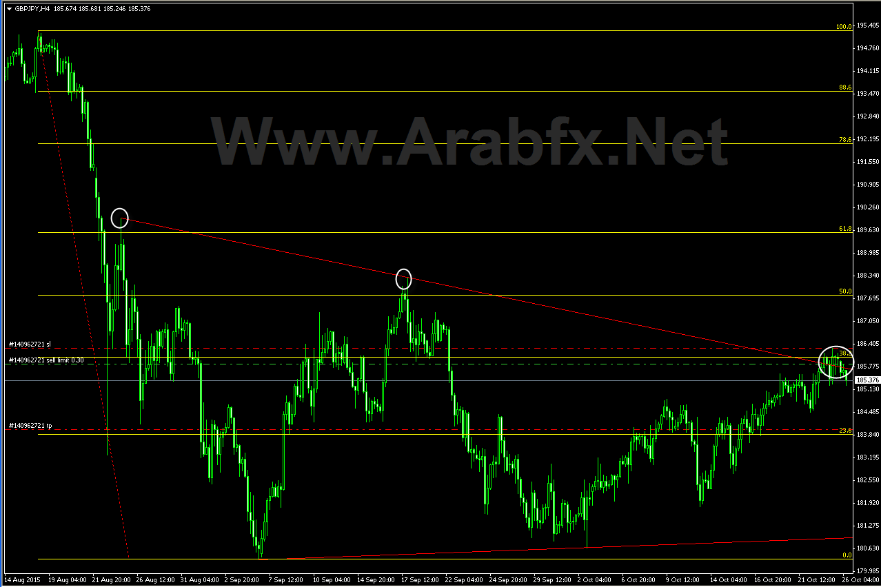 الباوند ين على 4 ساعات يتداول داخل مثلث هابط حاليا مع البيع من قرب الحد العلوى للمثلث يعنى من 185.80